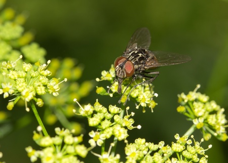 Housefly is sitting on a small yellow flowers. Animals in wildlife. Summer day.
