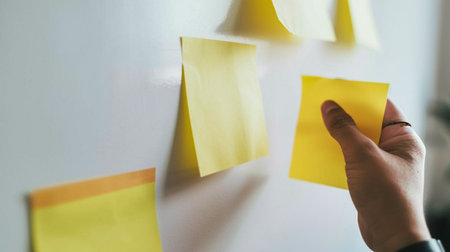 A hand places a yellow sticky note on a white surface, illustrating concepts of planning, ideas, and tasks.