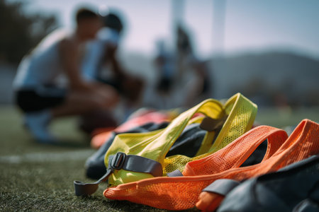 Brightly colored training bibs arranged on the ground by a football field during a sunny afternoon practice with team members focused in the background