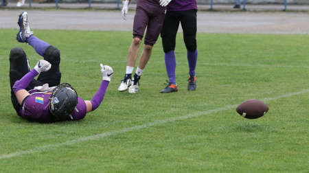 ODESSA, UKRAINE - May 30, 2021: American football on the grass. A tough duel, a battle between Odessa REINGERS and Nikolaev VIKINGS on the wet lawn of stadium. Tough American Football Athletes Battle