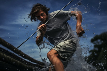 Casting Waves: A Man in Blue Shirt and Gray Shorts Sets Sail with his Fish Net