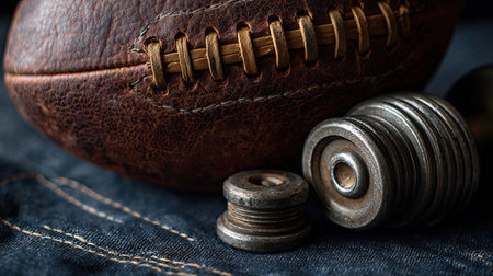 This image features a vintage leather football alongside metal weights placed on denim fabric, evoking themes of sports, fitness, and athletic dedication.