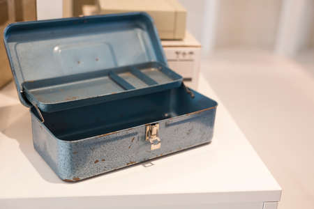 blue metal toolbox on white desk