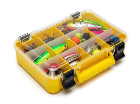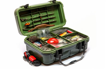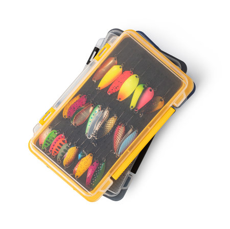 Open fishing tackle box on white background.