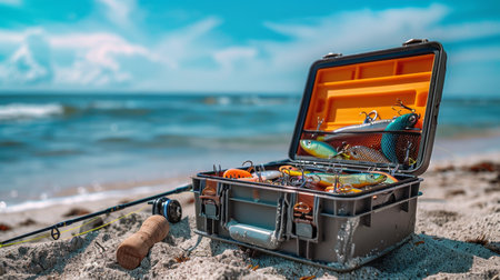 Fishing Tackle Box Resting on Sandy Beach With Gentle Waves Lapping at the Shore During Sunny Day. Generative AI
