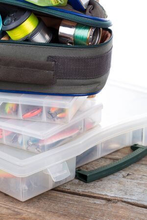 fishing tackles and baits in box and bag on wooden boards background for outdoor active business