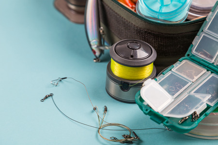 Close-up of fisherman's fishing equipment box. Fishing and sport concept.