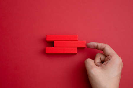 Business concept growth success process. Wood block stacking as step stair on paper peach and black background, copy space. Male hand.