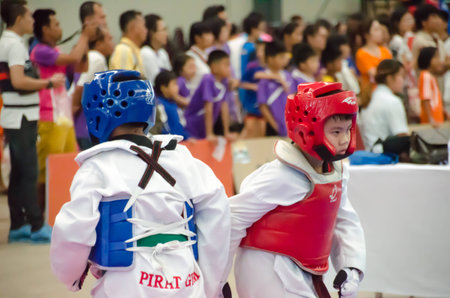 SURTTHANI, THAILAND - JULY 12: Unidentified Thai students 4 - 17 years old in action at suratthani taekwondo championship 2014 on July 12, 2014 in Suratthani, Thailand.