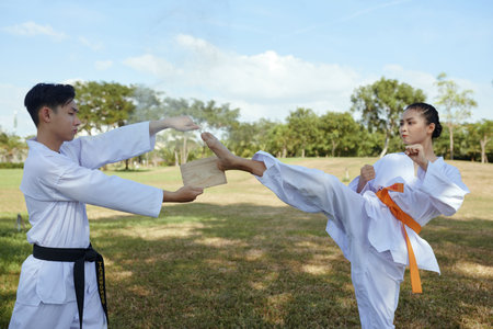 Practicing taekwondo with durable kick pad targets, martial arts concept