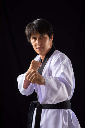 Portrait of an Caucasian professional taekwondo black belt degree (Dan) preparing for fight