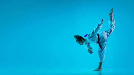 Concentration. Professional female judoist in white judo kimono practicing and training isolated on blue neon background. Grace of motion and action. Healthy lifestyle, sport and movement concept.