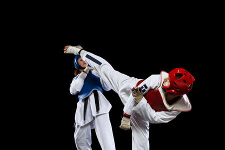 Dynamic portrait of two young women, taekwondo athletes training together isolated over dark background. Concept of sport, skills