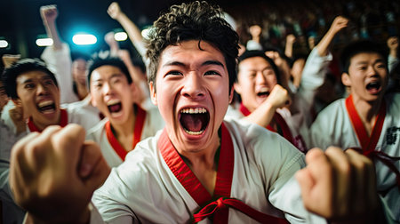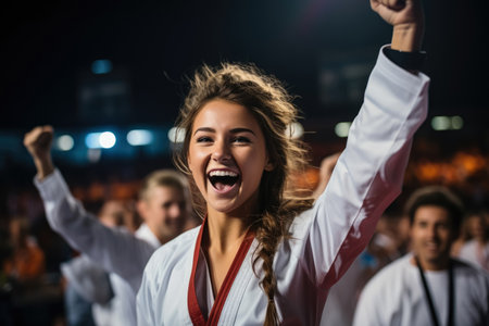 Karate woman raises her hands in joy after winning a competition in the stadium.
