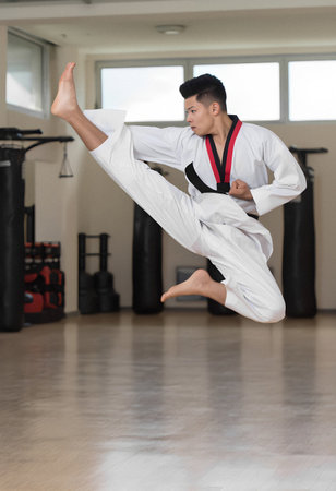 Asian male in a white kimono practices martial arts in martial arts hall, kick in a jump.