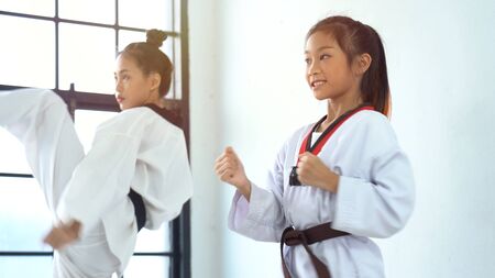 martial art concept. teen kid practicing martial art. girl martial fighter on sky background