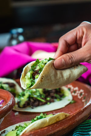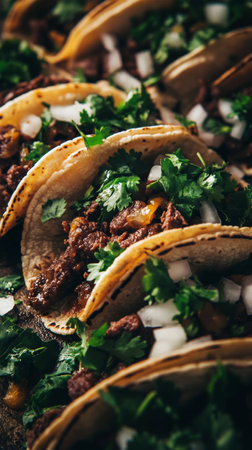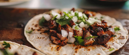 Close-up of delicious beef tacos with fresh cilantro and onions, Mexican street food concept
