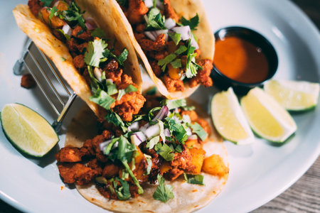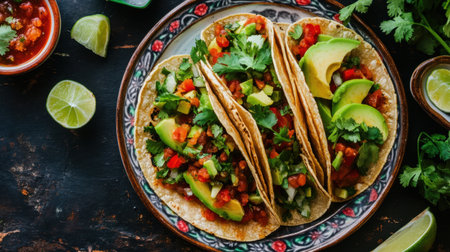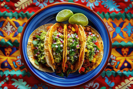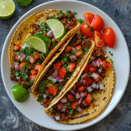 Enjoy a vibrant plate of tacos filled with fresh ingredients, herbs, and lime slices, perfect for any meal or culinary celebration, showcasing delicious traditional flavors.