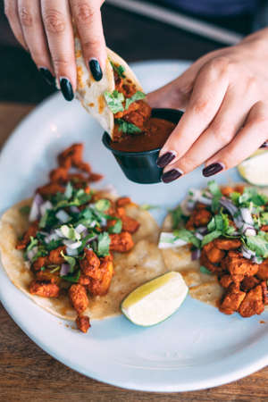 Mexican woman hands preparing tacos al pastor with sauce in Mexico city