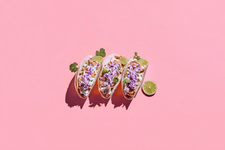 Three tacos are artistically arranged on a vibrant pink surface. The tacos are filled with a mix of ingredients and topped with fresh lime wedges and cilantro. The lighting creates a soft, dramatic effect on the surface.