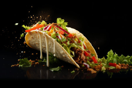 Fresh hot taco with flying ingredients on the black background