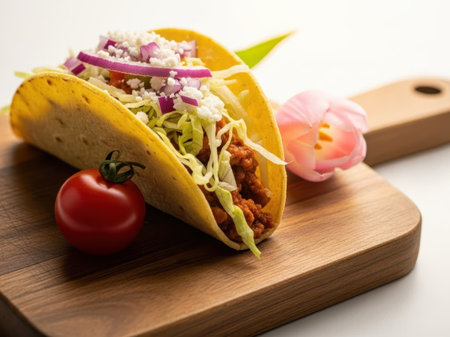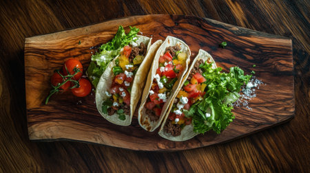 Delight in these tasty tacos featuring fresh ingredients and vibrant colors, beautifully presented on a rustic wooden board. Perfect for food lovers and culinary enthusiasts.