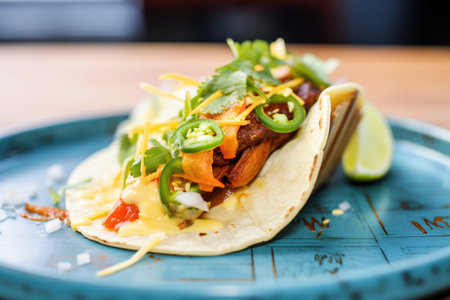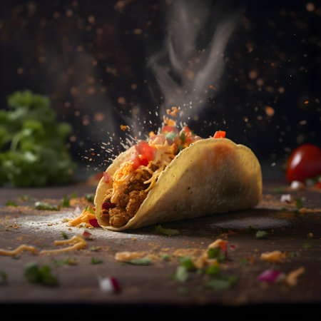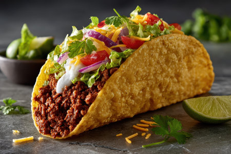 Mouthwatering Mexican taco with seasoned beef, fresh vegetables, and tangy lime ready to be enjoyed on a casual dining table