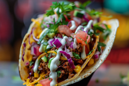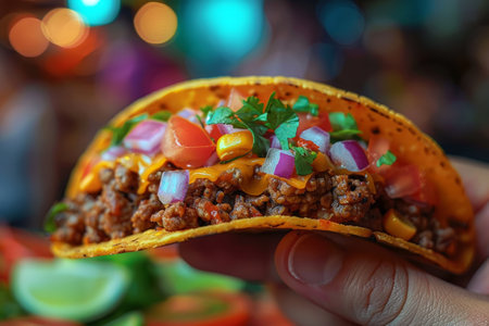 Hand-held taco with vibrant toppings, perfect for fast-food promotions and recipe websites. Trendy Mexican food. With Generative AI technology.