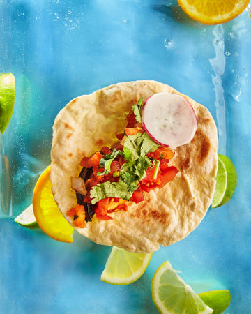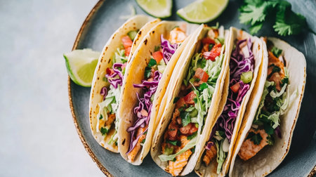 Enjoy a vibrant plate of delicious tacos filled with fresh ingredients like vegetables and fish, served with lime for a delightful culinary experience.
