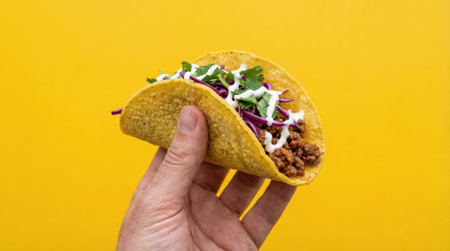 A persons hand holds up a single crispy corn taco filled with seasoned ground meat, fresh cilantro, and a creamy white sauce against a vibrant solid yellow background.