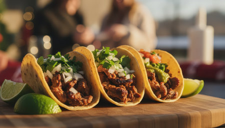Colorful street tacos filled with seasoned meat, fresh vegetables, and vibrant sauces, arranged on a wooden board, capturing the essence of street food culture and evening ambiance
