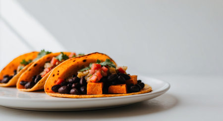 AI Generated. Sweet potato black bean tacos with salsa closeup