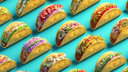 A visually striking display of assorted tacos featuring vibrant toppings and fresh ingredients, perfect for food enthusiasts and gatherings.