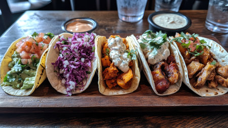 Enjoy a vibrant mix of colorful tacos on a wooden board, featuring fresh ingredients, herbs, and savory flavors perfect for a delicious meal.