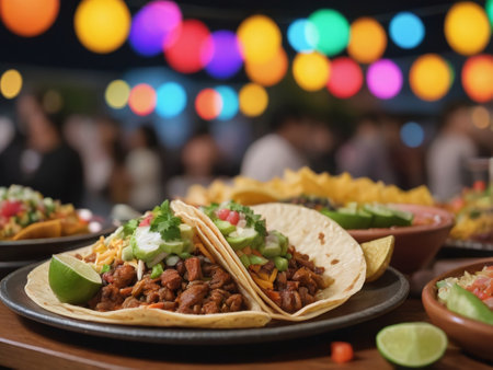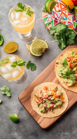Cinco de Mayo celebration with tacos, drinks, and colorful decorations, food background, AI generated
