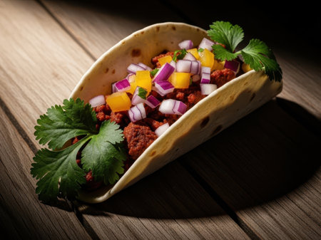 Detailed view of a vibrant taco with various ingredients on a wooden table, A colorful and overflowing taco