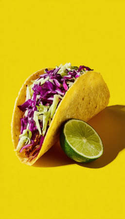 Vibrant Jackfruit Taco with Cabbage Slaw and Lime on Yellow Background