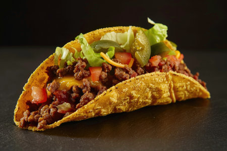 Mexican tacos with beef, cheese and vegetables on a black background