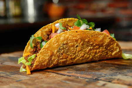 A crunchy taco shell filled with savory meat, tacos in tortilla shells with fresh vegetables AI generated