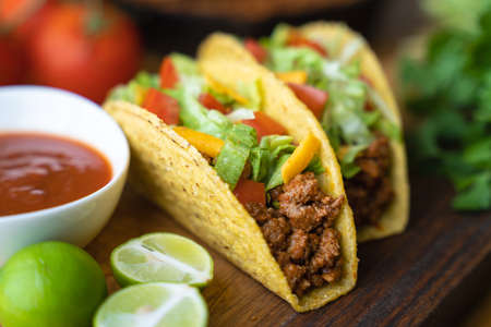 Mexican Taco: Mexican tacos with meat, vegetables and cheese on dark background.
