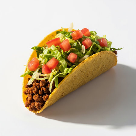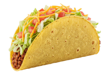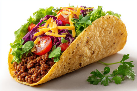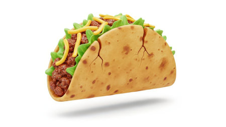 Delicious realistic taco filled with seasoned meat, fresh vegetables, and cheese isolated on white background