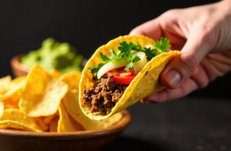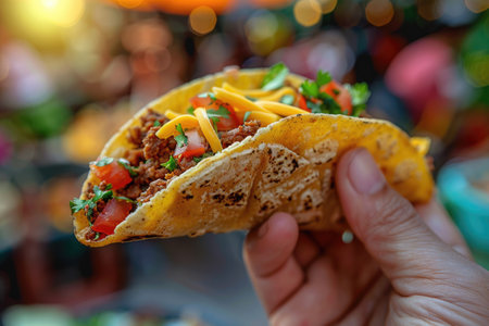 Cinco de Mayo holiday celebration, hand holding national snacks tacos. AI Generated