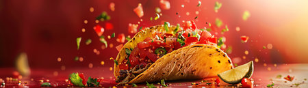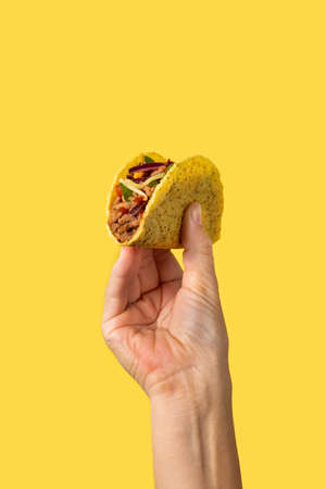 Experience the vibrant appeal of delicious tacos filled with fresh vegetables and savory meat, set against a bright yellow background, ideal for food-themed projects.