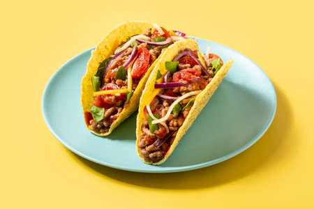 Mexican tacos with beef, vegetables and cheese on yellow background. Flat lay, top view, selective focus. Copy space