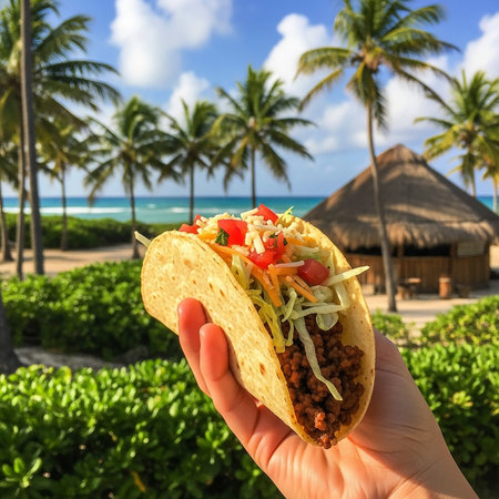 A hand holding a taco filled with ground beef, shredded cheese, diced tomatoes, and shredded lettuce. The taco is isolated on a white background with a blurred background featuring palm trees, a beach, and a thatched-roof hut.