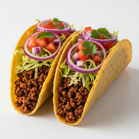 This image features two tacos filled with ground beef, shredded lettuce, sliced red onions, diced tomatoes, and fresh cilantro. The tacos are presented on a clean, white background, making the vibrant colors of the ingredients stand out clearly. This dish is a popular Mexican cuisine item, perfect for a quick and delicious meal.