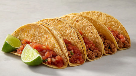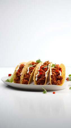 A mouthwatering display of soft tacos filled with ground meat, topped with fresh herbs and vegetables, perfect for any festive occasion or casual meal.
