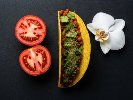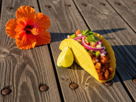 Capture the essence of culinary delight with this taco featuring savory ground beef, fresh vegetables, and a lime slice, perfect for food-related projects.