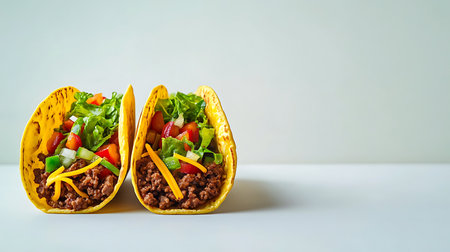 Showcasing two appetizing tacos stuffed with seasoned ground beef, lettuce, diced tomatoes, green bell peppers, white onions, and shredded cheese on a white surface.