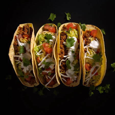 Three delicious tacos filled with ground meat, corn, and fresh cilantro, beautifully arranged on a dark background, ideal for showcasing culinary delights.